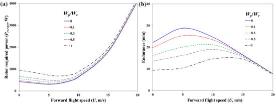 UAVs for delivery missions have various payload weights. Figure 8a,b show Pre,rotor and the estimated endurance for various payloads. The ratio of Wp to Wv changes from 0 to 1 and Cd is fixed at 0.96. In the hovering mode (U = 0), Pre,rotor increases as Wp increases. When Wp/Wv is 1, the endurance is 9.3 min, which is less than half of the endurance (22.2 min) when Wp/Wv is 0. As Wp/Wv changes from 0 to 1, the optimum flying speed gradually increases. When Wp changes, the power for overcoming the drag remains constant at the same flight speed U, because the frontal area and Cd are unchanged. Therefore, an increase in the induced power leads to a larger optimal speed.