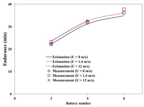 To validate the proposed endurance estimation, several endurance measurements are made for drones with various total weights and nominal capacities. W and C0 are varied by changing the number of batteries, and the test conditions are provided in Table 3. The endurance estimated by the proposed method is compared with the experimental results in Figure 9. Results show that the positive slope of the flight time decreases with an increase in the battery capacity. This implies that additional batteries are not an effective solution to increasing the endurance. The maximum difference between the measured and the estimated endurances is 5.47% and the average estimation error is 2.3%. Results show that the proposed method is suitable in the preliminary design phase.