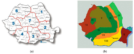 Territorial distribution of developmental regions of Romania and the renewable energy potential: (a) Development regions of Romania [47]. 1-North-East region, 2-South-East region, 3-South-Muntenia region, 4-South-West region, 5-West region, 6-North-West region, 7-Central region, 8-Bucharest-Ilfov region; (b) Romanian renewable energy potential [49]. I-solar energy, II-solar, biomass, and wind energy, III-micro-hydro, wind, and biomass energy, IV-biomass, micro-hydro, and wind energy, V-micro-hydro and biomass energy, VI-geothermal and wind energy, VII-biomass and micro-hydro energy, VIII-biomass, geothermal, and solar energy.