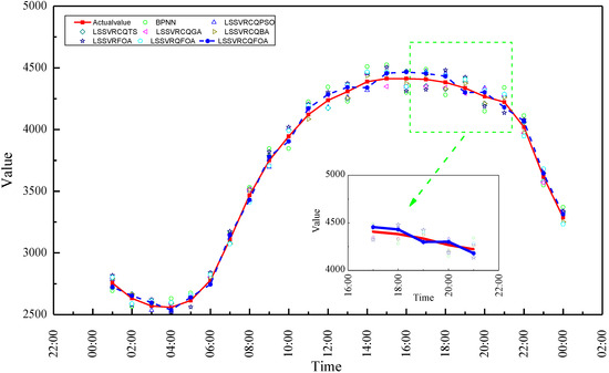 Based on the same training settings, another representative model, the back-propagation neural network (BPNN) is compared with the proposed model. The forecasting results of these models mentioned above and the actual values for IDAS 2014, GEFCom2014 (Jan.) and GEFCom2014 (July) are given in Figure 2, Figure 3 and Figure 4, respectively. This indicates that the proposed LS-SVR-CQFOA model achieves a better performance than the other alternative models, i.e., closer to the actual load values.