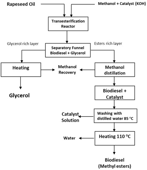 Schematic flow diagram of the biodiesel production from rapeseed oil.