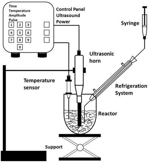 Potassium hydroxide (KOH, pellets GR for analysis), used as a catalyst, was supplied by Merck (Darmstadt, Germany) and methanol, 99%, was supplied by Panreac (Castellar del Vallés, Spain). The other chemicals were obtained commercially (Merck) and were of analytical grade. The experimental design is shown in Figure 1. The transesterification was carried out in a 500 mL spherical reactor, with a temperature sensor, sampling outlet and condensation systems, using a sonicator (Digital Sonifier, model 450, Branson, MO, USA), as shown in Figure 2. This sonicator has a fixed working frequency of 20 kHz and a power of 400 W, with adjustable levels for the latter between 0 and 100%.