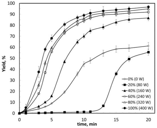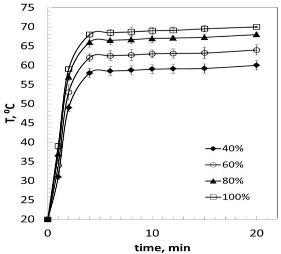 In addition, Figure 4 shows the evolution of temperature with reaction time for ultrasound powers between 40 and 100%. In all cases the same trend was observed: in the first minutes of reaction, the temperature increased very quickly, and later it stabilized at a constant value. The time required to achieve this constant value was between 3 and 4 min, and the maximum values of temperature were proportional to the applied power (60, 64, 68 and 70 °C for 40, 60, 80 and 100% powers respectively). Therefore, a balance between the heat generated as a consequence of the ultrasound radiation and the heat lost through the walls of the reactor took place. The result is a process that occurs near the isothermal regime. Another aspect to consider is the energy consumption. Ultrasonic powers of 160–240 W gave 90% yields. These results are in accordance with other research data, with similar power ranges and over 90% yields [22]. However, thermal powers of 500 W only produced a 55% yield. This implies a considerable energy savings.