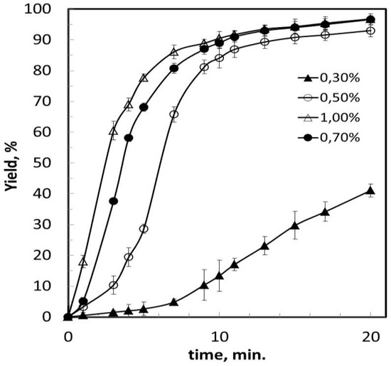Like in other works, it is possible to see two areas. In the first one, which can extend up to 7–12 min, a positive influence on the amount of catalyst on the rate of formation of methyl esters was observed. Indeed, as the amount of catalyst increased, it reached peak production sooner, that is, the asymptotic zone of the curve. The second area of the curve (the asymptote) was very similar in all cases (except for 0.3%).