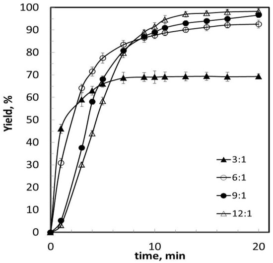 Also, in connection with the previous figure, it can be noted that in the experiment with a molar ratio of 3:1, the reaction was stopped at 9 min due to the fast and excessive increase in temperature (80 °C at the end), which made the control of this variable difficult. In addition to the above, the low effect of temperature in ultrasonic system is related to the collapse of bubbles caused by cavitations that produced intense local heating and high pressures, with very short lifetimes, which have a much higher effect than elevating the temperature of the liquid media. Furthermore, temperature affected the vapor pressure, surface tension, and viscosity of the liquid medium. While higher temperature increased the number of bubble cavitations, the collapse of bubbles was cushioned by the higher vapor pressure, reducing the effect of ultrasound application in the reaction [27].