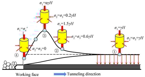 The abutment pressure of coal masses before the coal face differs under various mining paths. The coal masses before the coal face can be classified as areas of primary stress, stress concentration and pressure relief in accordance with the distribution of abutment pressure. Xie et al. [] carried out a lot of in-situ stress measurements and characterised stress evolution on the basis of differences in abutment pressure under three mining paths, as shown in Figure 1.
