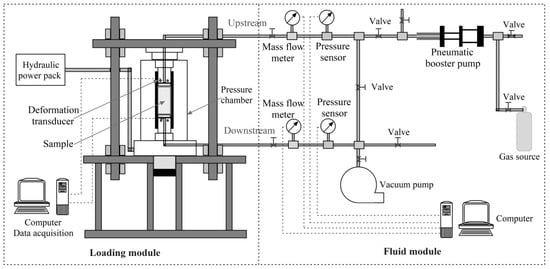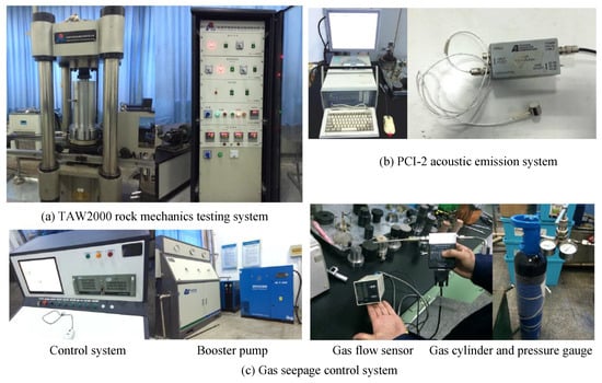 The coal sample is installed in the pressure chamber, and the deformation sensor and the AE sensor are mounted outside the coal sample. Data acquisition is realized by computer. The triaxial test machine realizes the loading of external stress by using a hydraulic system. The seepage system is connected to the two sides of the coal sample through the pipeline. A booster pump is employed to increase the gas pressure (nitrogen cylinder) to a certain pressure. Then, the gas penetrates one end of the coal sample and flows at the other end. The gas permeation measurement system comprises a pressure sensor and flow meter. The vacuum pump is also connected with the pipeline of the seepage system, and the gas in the pipeline is evacuated before the test. Pressure sensors and flow sensors are installed upstream and downstream of the pipeline to measure gas pressure and flow rate.