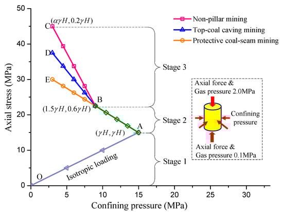 The loading speed of hydrostatic pressure was 3 MPa/min, pressure was loaded to 15 MPa () and gas pressure was 2 MPa. Line OA represents the loading to achieve the initial state, i.e., hydrostatic pressure state. The coal in this stage is not affected by the mining.