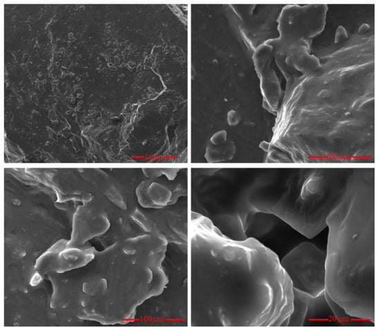 A scanning electron microscopy (SEM) image of a coal specimen is shown in Figure 5. In Figure 5, the coal mass almost lacks microcracks. Although the coal mass exhibits a large number of pore structures, its fracture development is not obvious and is pores are unconnected. Observing the pore structure of coal under high magnification revealed the absence of obvious fractures and the lack of pore convergence. The coal sample has low macroscopic permeability despite the presence of numerous pore structures. The mineralogical composition of coal mass is mainly aluminosilicate, such as quartz, kaolinite and white mica. The main chemical composition of the ashes is SiO2, Al2O3, CaO, Fe2O3, TiO2, MgO, K2O, Na2O, P2O5, SO3. Microscopic scanning is an effective means to observe the microstructure of coal. The microstructure has a decisive influence on the macroscopic parameters, such as strength and permeability of coal. When the fracture structure of coal body is densely distributed and the connection characteristics are obvious, the strength of coal body will be greatly reduced and the permeability will also be reduced. From the microscopic observation of coal in this test, we can see that the fracture structure of coal is not obvious. From the test results of composition analyses, the main component of coal is quartz, so it is also characterized by dense and hard. Therefore, the coal mass presents a tight and hard physical state at the macroscopic level, and we need to further analyze the mechanical characteristics through the experiment.
