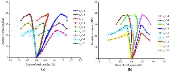 Deviatoric stress–strain process of coal samples. (a) coal samples C-1, C-2 and C-3; and (b) coal samples C-4, C-5 and C-6.