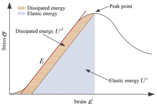 As shown in Figure 7, the stress and strain curve of the coal mass is used to analyse the elastic deformation energy and dissipative energy in coal samples. is the axial stress, MPa, is the axial strain, and E is the modulus, MPa. The energy absorbed by the coal mass can be calculated by the flowing equations:
