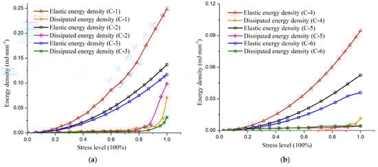 Curves of the energy evolution of coal samples during loading. (a) coal sample C-1, C-2 and C-3; and (b) coal sample C-4, C-5 and C-6.
