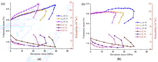 Relationship between volumetric strain, permeability and deviatoric stress of coal sample. (a) coal sample C-1, C-2 and C-3; (b) coal sample C-4, C-5 and C-6.