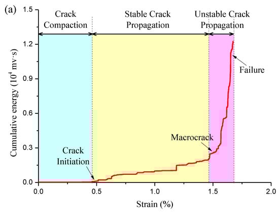 (2) Unstable crack propagation stage: This stage corresponds to the plastic deformation stage of coal samples. Under stress loading, microcrack development and crack propagation in the coal transform a portion of energy into dissipated energy. The cumulative energy curve of AE gradually increases, AE activity collectively remains at a low level and energy accumulation slowly increases.