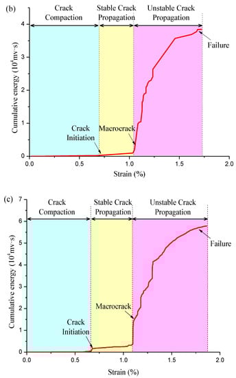 Representative curves of cumulative AE energy with the axial strain of coal specimens under different mining paths. (a) Sample C-1; (b) Sample C-2; (c) Sample C-3.