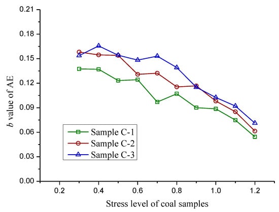 The value of b illustrates the relationship between distribution parameters of the amplitude and frequency of AE signals. The increase in b value implies the increase in a small AE events proportion and the number of small cracks. An unchanged b value indicates that the magnitude distribution of AE events is maintained at a constant ratio. A decrease in b value indicates an increase in the large fractures number.