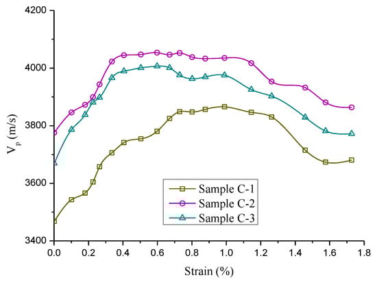 To illustrate the influence of mining paths on ultrasonic velocity, the P-wave velocity of coal samples is shown in Figure 12. As shown in Figure 12, the velocity of P-wave varies with mining paths. The P-wave velocity is enhanced when the mining paths change from the protective coal-seam mining to the non-pillar mining. The P-wave velocity and AE event can be characterised by three stages, as shown in Figure 13. During the initial compression deformation stage (stage I), the velocity of P-wave increases rapidly and the AE count is low. During the line elastic deformation stage (stage II), the accumulated AE count gradually increases and the velocity of P-wave fluctuates. During the nonlinear deformation stage (stage III), the velocity of P-wave decreases and the AE counts exponentially increase. In the residual strength stage, the velocity of P-wave decreases and the accumulated AE count gradually increases.