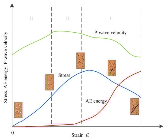 Axial pressure was increased at the speed of 2.7 MPa/min to 22.5 MPa (), the confining pressure was decreased at the speed of 1.2 MPa/min and the ratio of the loading speed of and unloading speed of was 2.25:1. Line AB represents the increase of vertical stress and the decrease of horizontal stress. Line AB corresponds the stage of ①–② in Figure 1.