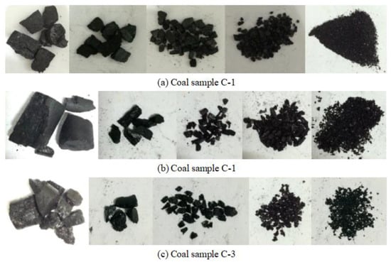 Fractal dimensions can be used to analyse the influence of mining paths on fracture network of coal masses. The coal breaks into fragments of different shapes when it reaches its peak strength, and these fragments have a statistical size distribution. Fractal dimensions are calculated on the basis of the relationship between the number and the shape and size of rock fragments []. Figure 14 shows particle size distribution (PSD) after coal destruction under different mining paths. The PSD statistical results are shown in Table 2. The metal sifters with different mesh sizes are used to achieve the classification of different size of coal particles and weigh them with different scales.