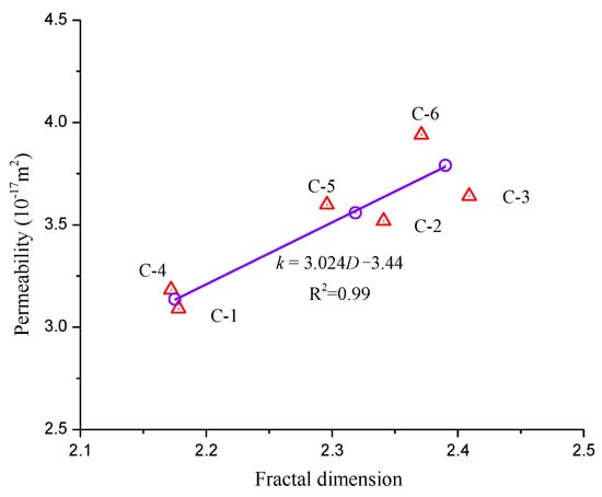 Figure 15 shows the permeability of fractured coal sample and fractal dimension in the residual state. Fractal dimension represents the complexity of the coal fracture network, and the fracture network determines the seepage of coal samples. Therefore, the permeability of coal samples can be obtained by analysing the coal fractal dimension. Coal fracture intensifies and fragmentation increases when the fractal dimension of coal sample is high. By contrast, a low fractal dimension indicates that fracture degree is low and fragmentation is limited.