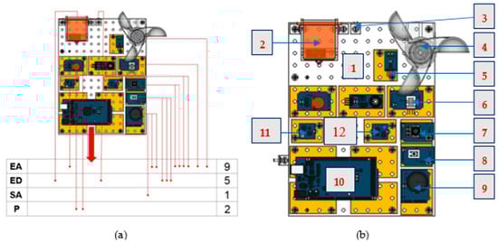 A recount of inputs and outputs of the prototype is also included in Figure 1a, where the number of analog inputs (EA), digital inputs (ED), analog outputs (SA) and communication ports (P) can be found. The aim of this operation is to check the validity of the chosen electronic processor. Moreover, the majority of components are from the supplier Seeedstudio® (x.factory, B608, Design Commune, Vanke Cloud City, Shenzhen, China) whose Grove product family presents the versatility of plug and play typology that simplifies significantly cable routing with a help of an Arduino shield, making routing more compact and agile in terms of putting it into operation.