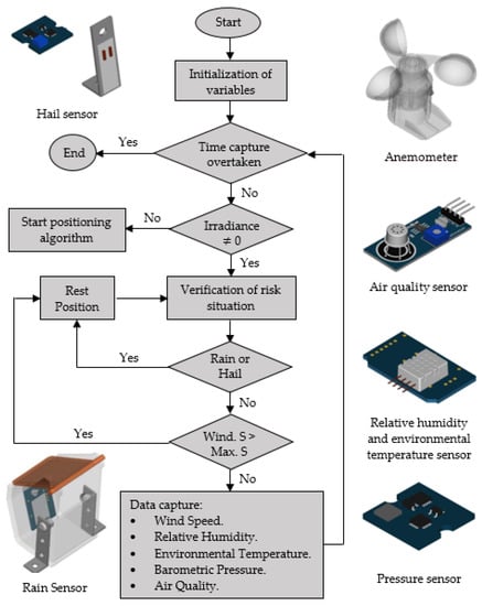 As can be observed, the flow chart of Figure 2 represents the setting up of a weather station and its functioning in case of its implementation in a solar tracking facility. Operations for this purpose can be defined as variables definition and initiation, measuring range establishment, tracking system positioning in azimuth and elevation to be used for this purpose, maximum wind speed confirmation, rain and hail tests, recording and storage of the rest of the weather data. Once the operations are modeled, programming intelligible by the robot was performed, which, with the aim to simplify the task, was carried out with the use of free application Visualino v.0.7.1 [], whose visual programming environment permits one to generate the code in form of a puzzle, letting programming blocks fall and interconnect in order to validate and to restructure the code in the IDE Arduino environment.