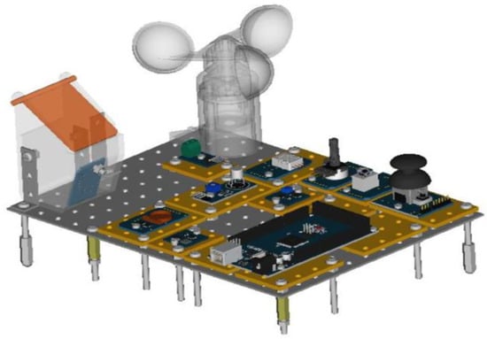 After choosing the components and establishing their functions in the weather station, a 3D design of the prototype was carried out in order to obtain a general visualization of all the sensors and assemblies. This design, which is shown in Figure 3, was carried out with the free FreeCAD v.0.16 software (SourceForge Media, LLC dba Slashdot Media, La Jolla, CA, USA) [], with great graphic power, and requiring scarce use of computer resourses and with the possibility to be adapted to the necessities of C language. It is a parametric design where each graphic element is treated as an object by itself, being defined not only by its space coordinates (x, y, z), but also by its characteristic graphic or functional parameters []. On the one hand, the design of mechanical components such as plates and lift profiling was carried out in line with real materials and devices, and on the other hand there was an electronic design, what is the most difficult part, not only because of the diversity of the devices but also because of the complex layout, including the Arduino Mega ADK 2560 card and environmental sensors.