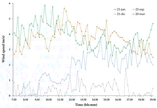 Considering the wind speed register readings it can be observed how the sensors give values according to different gusts produced throughout the day, obtaining very sharp values. It seems that there is no clear difference between the speed in the morning and in the afternoon. However, on the 21st of June the speed decreases over time, and on the 22 September it increases. In all analyzed cases the wind speed varies between values from 0 to 6 m/s.