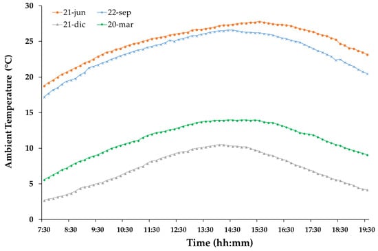 The measurement of ambient temperature is crucial for a possible passive conditioning of buildings constructed in an area. The obtained results show a progressive increase as the daytime hours pass, and a decrease afterwards with sunset as expected. The temperature increase seems to be similar in all cases, varying from 7 to 10 °C approximately, without sudden changes, between the winter and summer seasons.