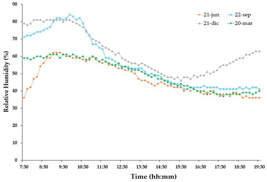 From the relative humidity measures taken under adequate hygrometric conditions for the seasons and susceptible to be interpreted using Givoni diagram, a decreasing tendency can be observed throughout the day. This tendency is caused by the fact that an important percentage of any morning dew evaporates over the day, decreasing the ambient humidity. The driest days (21 June and 20 March) present oscillations of about 40% and 60% and the wettest days (22 of September and 21 of December) oscillate between 40% and 80%. In all of the cases the values are appropriate for the continental type of climate [].