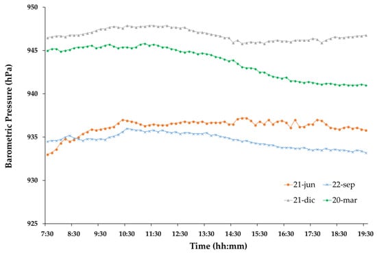 Barometric pressure (hPa) throughout the day.