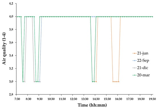 Figure 10 shows the values obtained for air quality. For this, a rating (1 to 4) inversely proportional to the concentration in μg/cm3 of polluting gases (CO, NO2 and O3) has been established. There is thus fresh air under optimal conditions (rate 4 corresponding to a maximum of 50 μg/cm3), air with a small concentration of gases (rate 3 corresponding to a maximum of 80 μg/cm3), high pollution and high concentration of harmful gases but without the necessity to take protection measures (rate 2 equivalent to a maximum of 140 μg/cm3) and high pollution with the need to take precautionary measures (rate 1 equivalent to 180 μg/cm3 at most).