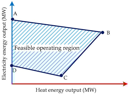 Note that both the WT and PV units are operated at their maximum power points under the current weather conditions [], thus they do not require a consensus interaction with other controllable devices. Besides, it can be found from Equation (6) that both the lower and upper limits of the electrical energy output of CHP units are determined by different heat energy outputs and vice versa, which indicates that the energy outputs of CHP units should be enclosed by the boundary curve ABCD (i.e., the feasible operating region) [], as shown in Figure 2.