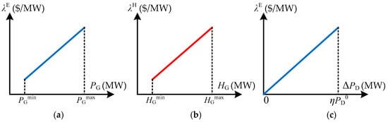where PGi and HGi are the electricity and heat energy outputs of the ith energy supplier, respectively; ΔPDi is electricity energy curtailment of the ith energy consumer which participates in demand response (DR); ΩG and ΩD are the sets of the energy suppliers and consumers, respectively; and fi denotes the operating cost of the ith energy supplier or consumer, which can be calculated as follows []:
