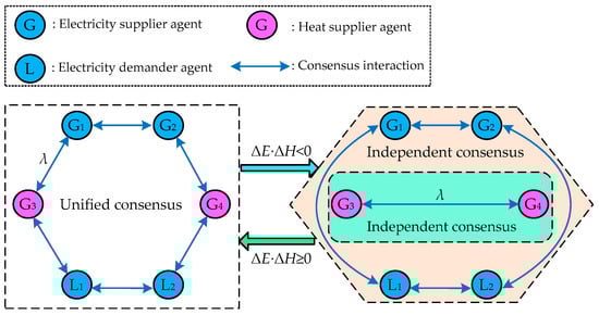 Therefore, each agent will regulate its incremental cost between these two consensus modes according to the sign of (ΔE·ΔH), as illustrated in Figure 5. After a series of consensus interactions by Equations (15) and (16), the energy balance constraints Equations (4) and (5) can be satisfied since both the electricity energy mismatch ΔE and heat energy mismatch ΔH will be sufficiently small. It is important that each interaction network should be strongly connected, i.e., any vertex can be realized from any other vertex by a directed path, thereby the consensus convergence can be guaranteed.