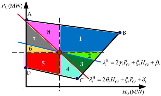 - CHP unit: Since the electrical and heat energy outputs are highly coupled, the incremental cost should be controlled to meet the energy balance constraints and the feasible operating region constraint. Hence, the feasible operating region is decomposed into eight searching sub-regions, See Figure 6, allowing the CHP unit to adjust its energy outputs based on the current energy mismatches and the consensus value of incremental costs, as given in Table 1.