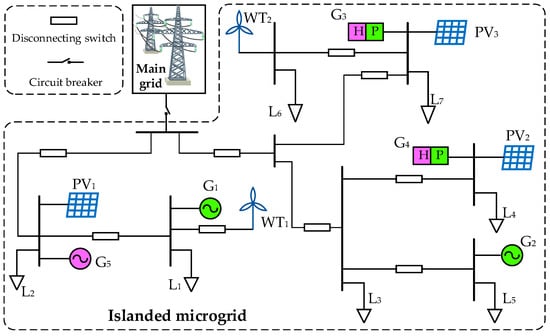 Over the past decades, microgrids have attracted extensive attention and study as they provide an efficient and flexible way to integrate various distributed energy resources (DERs), local loads, and energy storage devices []. In general, a microgrid is a local energy grid which can be operated in either grid-connected or islanded modes []. When a microgrid is islanded, it needs to achieve an energy balance between the energy supply and the demand without the adequate power supply from the main grid [].