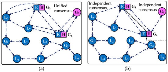 Interaction network of different agents. (a) Unified consensus; (b) independent consensus.