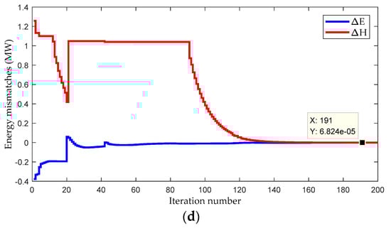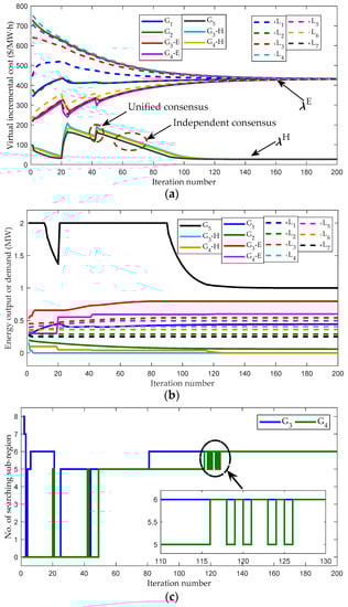 This case study is executed to reveal the convergence of ACA. Figure 9 shows the convergence process of ACA for distributed HEEM under scenario #1. It can be found from Figure 9a that the virtual incremental cost of each agent will update between unified consensus mode and independent consensus mode according to the dynamic energy mismatches, in which the incremental heat costs cannot reach a consensus with other incremental electrical costs due to the energy balance constraints Equations (4) and (5). Besides, some energy agents have reached their energy capability limits after a few interactions, as shown in Figure 9b. Moreover, two CHP units can adaptively adjust their energy outputs based on the adjusting rule in Table 1, see Figure 9c, where the zero searching sub-region indicates that the energy outputs of the CHP unit remain unchanged. Finally, both the electrical and heat energy mismatches (ΔE and ΔH) can simultaneously satisfy the energy mismatch tolerance after approximately 150 iterations, see Figure 9d, i.e., |ΔE| < τ and |ΔH|<τ. All of this proves that the convergence of ACA can be effectively guaranteed, while the consensus requirement and all the constraints Equations (4)–(7) can be fully satisfied.