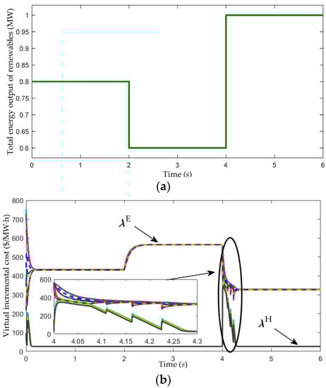 Real-time optimization of distributed HEEM by ACA. (a) Electrical energy fluctuation of renewables; (b) virtual incremental cost.