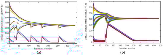 Owing to the lower and upper capability limits Equations (6) and (7), all the agents may not reach a consensus on the incremental cost. Hence, a virtual incremental cost [] is designed in ACA, which corresponds to the actual incremental cost of each agent. Note that each agent is responsible for computing its own incremental cost. More specifically, each agent can update its virtual incremental cost via a consensus interaction with adjacent agents by Equations (15) and (16), which is not limited by the constraints Equations (6) and (7). After updating the virtual incremental cost at each iteration, each agent can calculate its controllable variable by fully considering the constraints, while the actual incremental cost can be determined by Equations (9)–(11). Hence, all the constraints of distributed HEEM can be satisfied, while all the agents can reach a consensus on the incremental cost as much as possible.