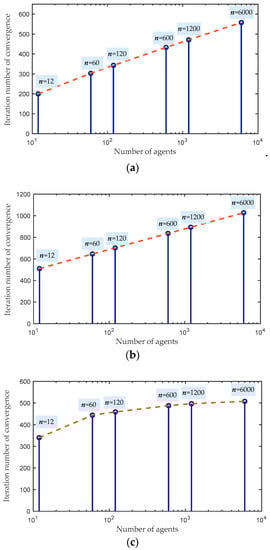 Iteration number of convergence under different numbers of agents by ACA. (a) Scenario #1; (b) Scenario #2; (c) Scenario #3.