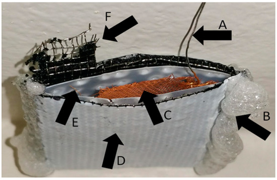 This is the V-shape cell type used in these experiments. (A) Platinum wire used to connect the anode to avoid corrosion contributing to the power output. (B) Adhesive used to prevent leaking. (C) Gold-plated platinum mesh used as the anodic surface. (D) Air-breathing cathode material. (E) Plastic with holes used to prevent electrode contact. (F) Current collecting framework of the air-breathing cathode material.