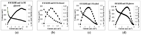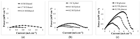 To compare this cell’s performance with other organic molecules that are also potential fuels, including sugars, small chain primary alcohols and other organic alcohols, this cell was also run with glucose, ethanol and xylitol as sample fuels. It was expected that these molecules would oxidize in a similar manner to the proposed oxidation of glycerol [16,17]. Each set of experiments was performed in non-optimized 8 M KOH solution with various concentrations of ethanol, xylitol, and glucose. Figure 5 displays the power production of (a) ethanol (0.218 mW cm−2), (b) xylitol (0.447 mW cm−2), and (c) glucose (1.74 mW cm−2).