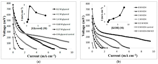 Figure 2 also displays the maximum performances for ethanol, xylitol, and glucose. Figure 3 demonstrates the cell’s voltage dependence on varying concentrations of glycerol and KOH. Experiments were performed in which glycerol concentrations of 0.27 M, 0.68 M, 1.4 M, 4.1 M, and 8.2 M in 8 M KOH were used as the cell’s fuel/electrolyte. To show power dependence on KOH, experiments were performed in which concentrations of KOH of 0.5 M, 1 M, 3 M, 6 M, and 8 M, were used in the presence of 1.4 M glycerol. Although power production increased as glycerol concentrations increased, there was an unexpected decrease in power production when the concentration of glycerol increased to 4.1 M. Optimal power production was observed under conditions of 8 M KOH and 1.4 M glycerol with a power of 1.27 mW cm−2 at 7.39 mA/cm2 solution (see Figure 3a).The reaction is also dependent on the concentration of KOH as depicted in Figure 3b. As the concentration of KOH increased, the power output also increased. To further investigate the effect from KOH, the combination of the electrolyte was changed. Instead of 8 M KOH, 3 M KOH and 5 M KCl were used as the electrolyte in the presence of 1.4 M glycerol. The polarization curve with KCl (see Figure 3b) shows a lower performance which suggests that the glycerol fuel cell is dependent on the hydroxyl ions. Control experiments with only glycerol (1.4 M) or KOH (8 M) were also included in Figure 3a,b. No significant amount of power was generated under such conditions.