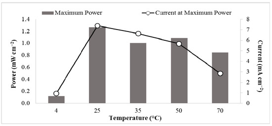 Temperature effects on the power output of the glycerol fuel cell were also included in this study. Fuel cells with solutions of 8.0 M KOH and 1.4 M glycerol were placed at 4 °C, 25 °C, 35 °C, 50 °C, and 70 °C (Figure 4). The open circuit voltage increased as the temperature increased (see Table 2). However, at 25 °C, a maximum power of 1.27 mW cm−2 occurred at 7.39 mA cm−2. As the temperatures increased to 70 ℃, the maximum power decreased to 0.848 mW cm−2 at 2.84 mA cm−2.