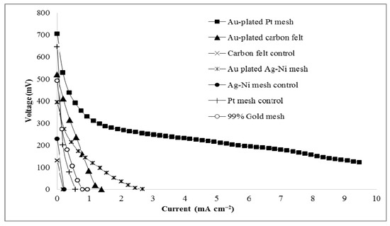 Glycerol fuel cells were simply made from the cathodic material utilizing different anodic surfaces. The materials used as anodic surfaces were 99% gold mesh (6.25 cm2), platinum mesh, gold-plated platinum mesh (5.28 cm2), carbon felt, gold-plated carbon felt (5 cm2, 3.18 mm thick), silver-plated nickel mesh, and gold-plated sliver-plated nickel mesh (4.94 cm2). All connecting wires were made of platinum to nullify any corrosive currents from contributing to the produced power.