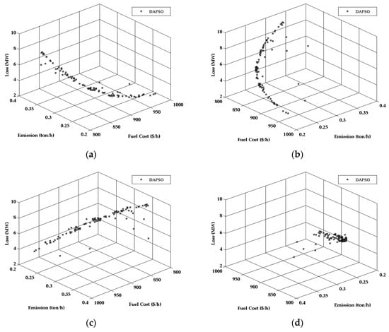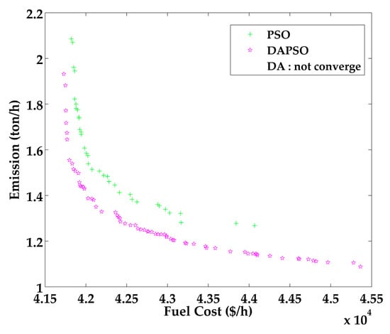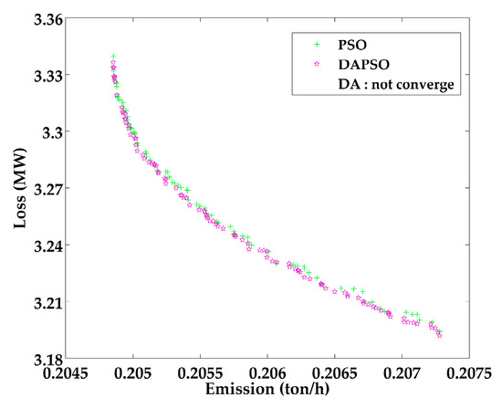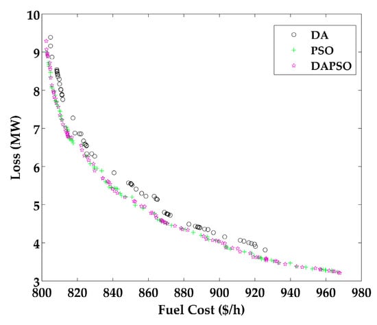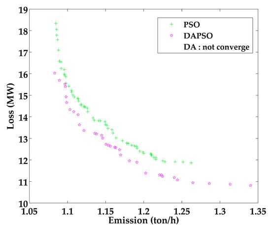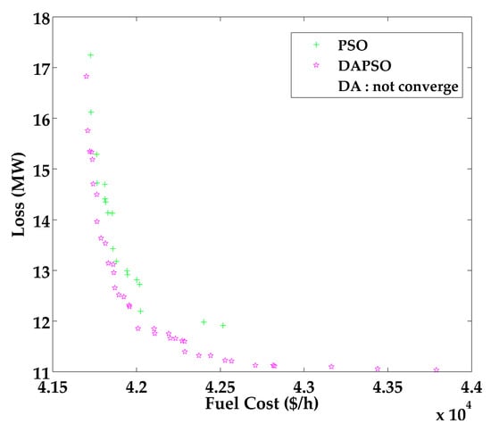 To solve the OPF problem, several traditional optimization techniques, such as nonlinear programming [5], quadratic programming [6], and the interior point method [7], have been successfully applied. However, these algorithms’ nonlinear characteristics make them impractical to use in practical systems. The nonlinear characteristics may cause the obtained solutions to be trapped in local optima, and these algorithms require an enormous amount of computational effort and time. Therefore, many optimization methods need to be improved to overcome these shortcomings [8,9]. Recently, several population-based optimization algorithms, including the OPF problem, have been employed to solve a complex constrained optimization problem in the field of power systems. Some of the other proposed techniques include the genetic algorithm (GA) [10], tabu search (TS) [11], differential evolution (DE) [12], evolutionary programming (EP) [13], probabilistic optimal power-flow (P-OPF) [14], preventive security-constrained power flow optimization [15], ant colony optimization (ACO) [16], grey wolf optimizer (GWO) [17], artificial bee colony (ABC) [18], particle swarm optimization (PSO) [19], and the dragonfly algorithm (DA) [20]. Even with the successful optimization of single-objective population-based optimization techniques, minimizing only one objective function is not sufficient in the power system because there are many problems, such as fuel cost, emissions, and transmission losses, which also need to be minimized. Consequently, many objective functions should be considered because this is a multi objective optimization problem. Since there are three independent objective functions in this study (i.e., fuel cost, emissions, and transmission losses), the number of incompatible optimal solutions between the objective functions is infinite, and these optimal solutions are called Pareto optimal solutions [21].