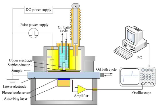 The space charge measurement system is shown in Figure 1 [22,23]. The amplitude of the DC power supply was ±30 kV. The pulse electric field generated by the pulse power supply (pulse width 10 ns) acts on the space charge to form a stress wave. The stress wave is converted into a voltage signal by the piezoelectric sensor. In this experiment, a P(VDF-TrFE) copolymer (which can typically work from −60 °C to 100 °C) was used for the piezoelectric sensor. The amplifier was used to linearly amplify the voltage signal. The oscilloscope was used to record the waveforms and upload the data to the PC. The temperature of the upper and lower electrodes was controlled by the oil bath cycle, and the test temperatures were set to −20 °C, 0 °C, 20 °C, 40 °C, and 60 °C. The test voltage of the DC electric field was set to 10 kV and 20 kV, and the measurement time for the voltage-on test and the short-circuit test was 1 h, with the measurement data were recorded every 10 s. The experiment was performed repeatedly, selecting three samples each time, and the data which reflects the average trend was selected for the experimental results.