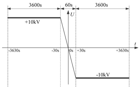 Figure 2 shows the process of voltage polarity reversal. Firstly, the positive voltage (+10 kV) was applied to the sample for 1 h. Then the voltage polarity was reversed from positive to negative in 60 s. Finally, the negative voltage (−10 kV) was applied to the sample for 1 h.
